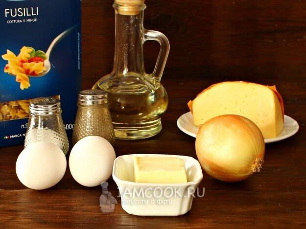 ИНГРЕДИЕНТЫ Макароны - 120 г Сыр - 50 г Яйцо - 2 шт. Репчатый лук - 100 г Масло сливочное - 25 г Растительное масло - 1 ст.л. Соль - по вкусу Перец ч.м. - по вкусу ПРОЦЕСС ПРИГОТОВЛЕНИЯ Макароны можно отнести к одним из самых простейших в приготовлении блюд. Макароны – это прекрасный завтрак для всей семьи. Сегодня приготовим не просто макароны с сыром, а макароны с яйцом и сыром на сковороде, дополненные обжаренным луком. Это блюдо не требует особых кулинарных навыков, а ингредиенты, из которых оно приготовлено, прекрасно гармонируют между собой. И несмотря на простоту продуктов, блюдо получается очень вкусным и сытным. Подготовим необходимые продукты. Макароны отвариваем в подсоленной воде до полуготовности. Откидываем на дуршлаг. В сковороду кладем сливочное масло, вливаем растительное и на умеренном огне обжариваем мелко нарезанный лук до золотистого цвета. В небольшую емкость вбиваем яйца, всыпаем сыр, натертый на мелкой терке. Солим и перчим по вкусу, перемешиваем. К обжаренн