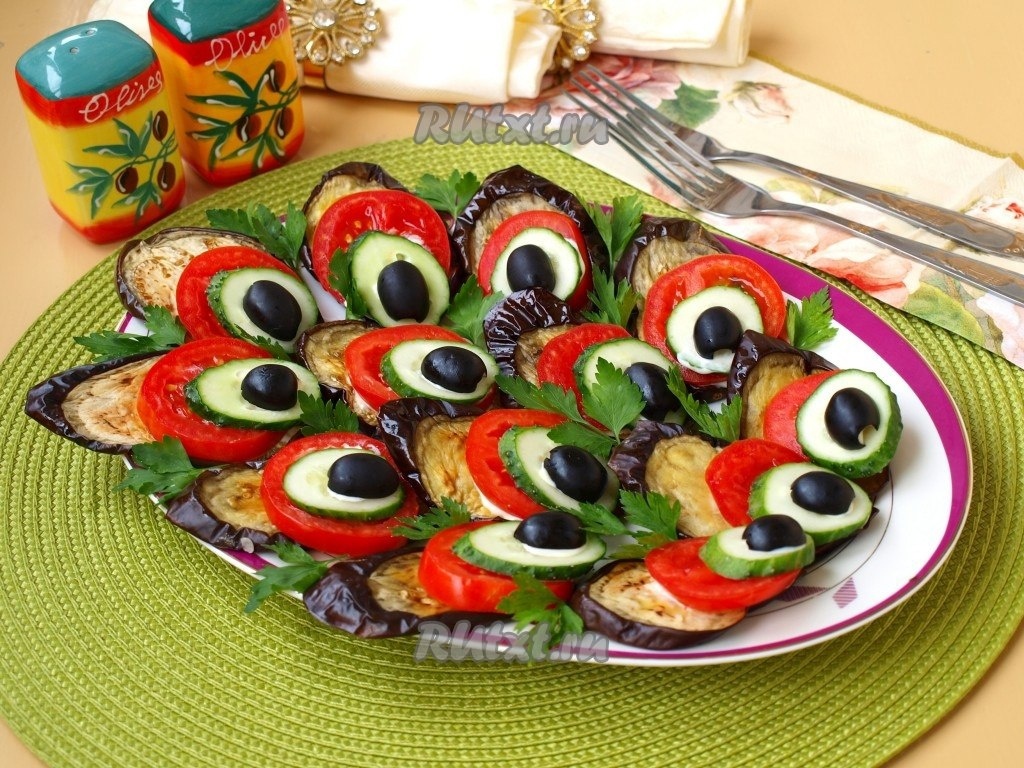 Ингредиенты Баклажаны - 2 шт. Помидоры - 2 шт. Огурец - 2 шт. Сыр твердый Чеснок Майонез Маслины Соль Процесс приготовления закуски "Павлиний хвост": 1. Нарезать баклажаны и положить их в миску. Посыпать большим количеством соли и перемешать. Оставить так на полчаса-час, чтобы ушла вся горечь. Затем очень хорошо промыть баклажаны водой. 2. Обжарить баклажаны на растительном масле с каждой стороны по 3-4 минуты. Далее переложить их на бумажное полотенце или пекарскую бумагу, чтобы убралось лишнее масло. 3. Нарезать помидоры кружочками или половинками. Огурцы нарезать кружочками. 4. Сыр натереть на крупной терке, добавить к нему мелко рубленный чеснок, перемешать с майонезом. 5. Теперь пришло время оформления закуски "Павлиний хвост". Перекладываем баклажаны на тарелку так, чтобы получилась форма павлиньего хвоста. Сверху на каждый кусочек кладем помидорку, на нее сырную смесь, затем огурец. На огурец укладываем половинку маслины. 6. Убираем закуску "Павлиний хвост" в холодильник миниму