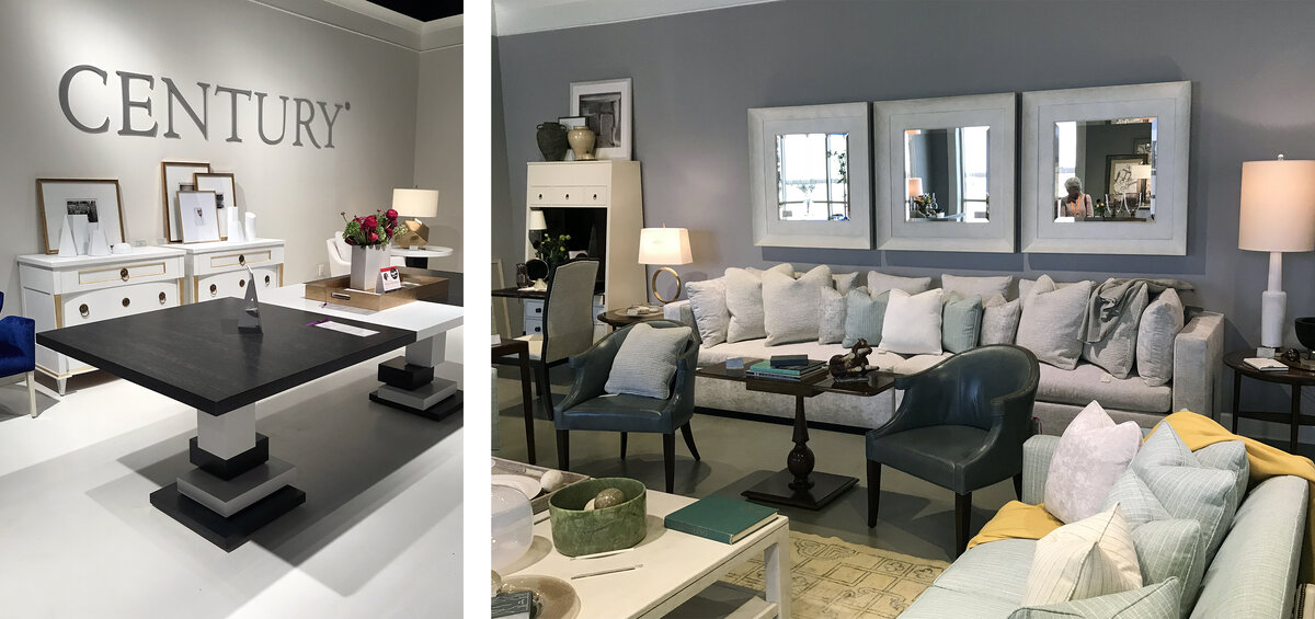 Century Furniture произвели особое впечатление на весеннем High Point. Они наконец-то переехали в новый прекрасно, по-современному оформленный шоу-рум. Новую коллекцию представил Thomas O'Brian. Хотя бы ради этого стоило не только попасть к ним, да и в принципе поехать на выставку. За работами Thomas O'Brian мы следим уже около 10 лет и обращаем особое внимание на его интерьеры и коллекции. Этот дизайнер редко использует яркие цвета, все решения тонко обыгрываются на полутонах. В коллекции Thomas O'Brian важно обратить внимание на цвета и их сочетание, деталировку, оформление декором. Огромное количество разных отделок: черный цвет, черный металл, латунь, хром — все в рамках одного пространства. То есть не надо бояться, уже можно) В одной композиции стояли лампа в черной коже, лампа из камня и лампа полностью из металла. В графичный черно-белый интерьер вписан и крупный арт. Были представлены и старые, и новые предметы из коллекций Thomas O'Brian. Многие предметы путешествуют с
