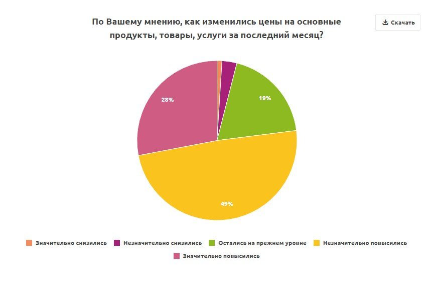 Большинство россиян (77%) отметили подорожание основных товаров и услуг за последний месяц, причем 28% указали на значительный рост потребительских цен в этот период. В то же время снижение цен почувствовали лишь 3% опрошенных. Продукты В целом россияне отметили подорожание всех представленных в нашем опросе категорий продуктов, за исключением соли и хлеба. По 68% опрошенных отметили повышение цен на фрукты и рыбу, 66% — на яйца, 65% — на мясо и птицу, по 63% — на молочные продукты и овощи. Также больше половины россиян почувствовали рост цен на сахар (53%), кофе и шоколад (по 55%). Повседневные товары Лишь от 3 до 4% россиян отмечали снижение цен на представленные нами 8 категорий повседневных товаров за прошедший месяц. Этот показатель всего на один процентный пункт превышает пределы погрешности исследования. Сильнее всего, по мнению опрошенных, в этот период подорожали лекарства, а также одежда и обувь. На повышение стоимости этих товаров указали 74% и 65% опрошенных соответствен
