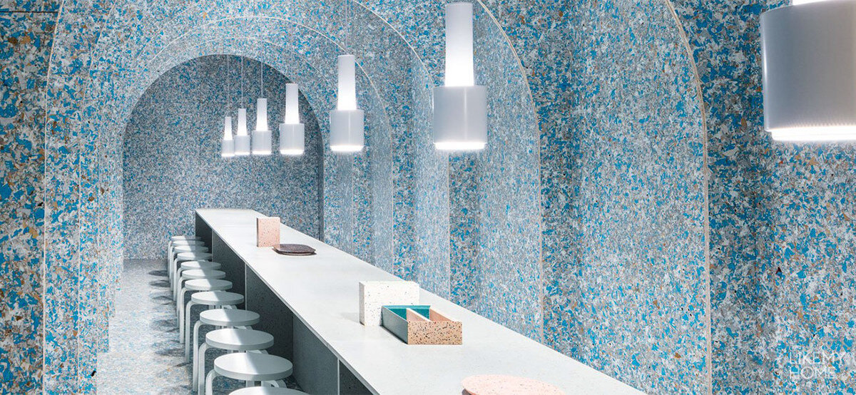 Вся основная конструкция бистро выполнена из гофрированной доски от бренда Durat — материала, на 100% изготовленного из отходов тетрапака. Финская компания Durat уже более 27 лет является пионером в экономике повторного использования, сводя к минимуму потребность в девственном сырье.