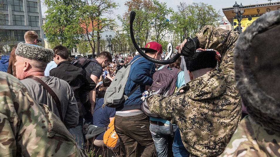 Эти люди были казаками, которые пришли, по их словам, чтобы посмотреть на протест 5 мая перед четвертой инаугурацией президента Владимира Путина для себя. Но они сделали больше, чем просто наблюдали. Вскоре после начала митинга, мужчины обвинили протестующих, ударив их и хлестнув их кожаными кнутами.