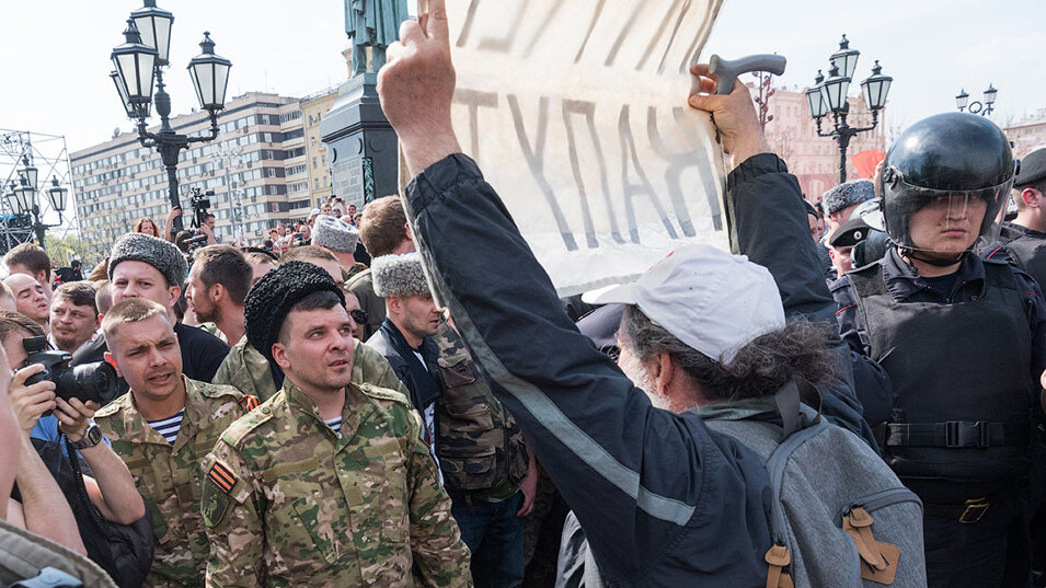 Это был один из первых жарких весенних дней, но десятки мужчин, собравшихся на центральной Пушкинской площади Москвы, были одеты в меховые шапки, тяжелую военную униформу и кожаные сапоги. Некоторые из них также носили кожаный аксессуар: традиционная нагайки кнут.