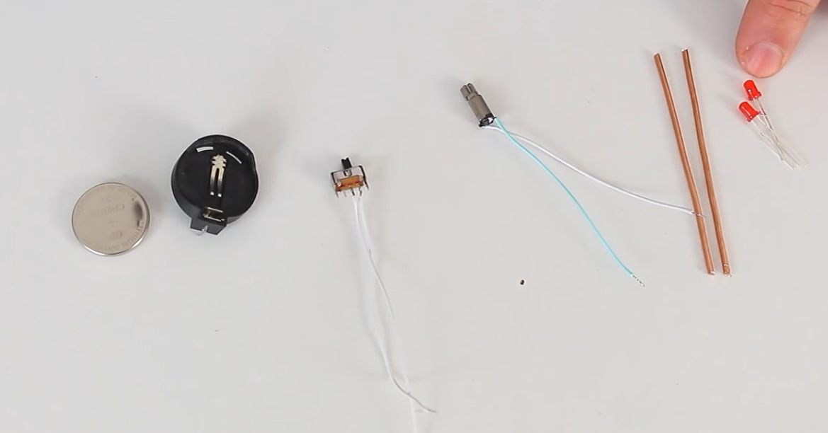 Для начала понадобятся два светодиода на 3 миллиметра, два кусочка медной проволоки длиной 7 сантиметров, вибратор, который можно достать из любого, старого мобильного телефона, небольшой выключатель, коннектор для батареек 2032. И первым делом следует припаять коротенькие лапки от светодиодов к минусу от коннектора для батарейки, минус находится посреди коннектора так, что берем светодиоды и начинаем припаивать, для начала коротенькие ножки мы слегка укорачиваем и после этого уже припаиваем. Далее соединяем эти ножки между собой примерно таким образом. После, при помощи термоклея приклеиваем по серединке моторчик. Теперь эти два проводка мы должны припаять к контактам от светодиодов и в этом случае полярность не имеет никакого значения. После этого следует припаять ножку светодиода и плюс от коннектора батарейки к выключателю. В завершении остается только сделать лапки для жука согнув аккуратно медную проволоку. Примерно такие лапки должны получиться. Остается их приклеить при пом