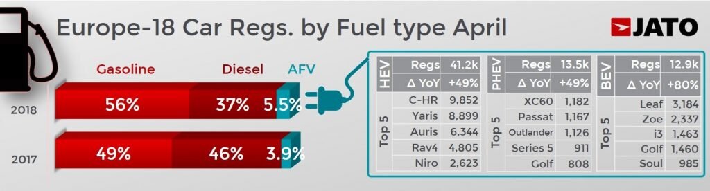 Небольшая инфографика, показывающая соотношение регистраций новых автомобилей в Европе за апрель этого и прошлого года. В анализ вошли данные по 18 наиболее показательным европейским рынкам. Самое интересное то, что за анализируемый период дизельный автотранспорт потерял 9% доли рынка. Большую часть, перераспределённого рынка пока что оттянули на себя те, кто купил бензиновые машины, но и "зелёные" автомобили поднялись с 3,9% до 5,5%.