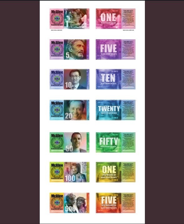 Джон Макафи поделился деталями о своих бумажных деньгах, привязанных к криптовалюте, которые будут выпущены 24 июня. Они будут называться платёжными единицами Макафи (McAfee Redemption Unit, MRU).
