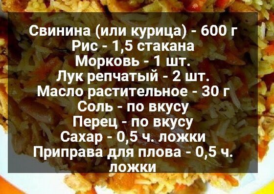 Здравствуйте Мои Дорогие!!!! Очень быстрый, вкусный и рассыпчатый плов на сегодня в нашем меню! Внуки и дети просто в восторге, тем более у нас Торжество! Мы создали сайт Вконтакте и в Одноклассниках, все самое новое Вы найдете там, присоединяйтесь!!!! Нажимайте на кнопку поделиться рецептами со своими друзьями и будет ВАМ СЧАСТЬЕ!!!! Ингредиенты: Способ приготовления: 1.Мясо порежем и пожарим в масле в казане. 2. Очищаем лучек и морковку,шинкуем и режем. 3. Добавим к мясу, тушим вместе, добавим специи. 4.Промываем рис до прозрачной воды и высыпаем в казан. 5. Заливаем водой на 1 см скрывая рис. 6. Ждем пока закипит вода, накроем плотно крышкой и готовим 30 минут на маленьком огне, после отключим и откроем крышку только через пол часа. Приятного Аппетита!!!! Подписывайтесь, Не забываем ставить класс))) Заходите ко мне по чаще!!!