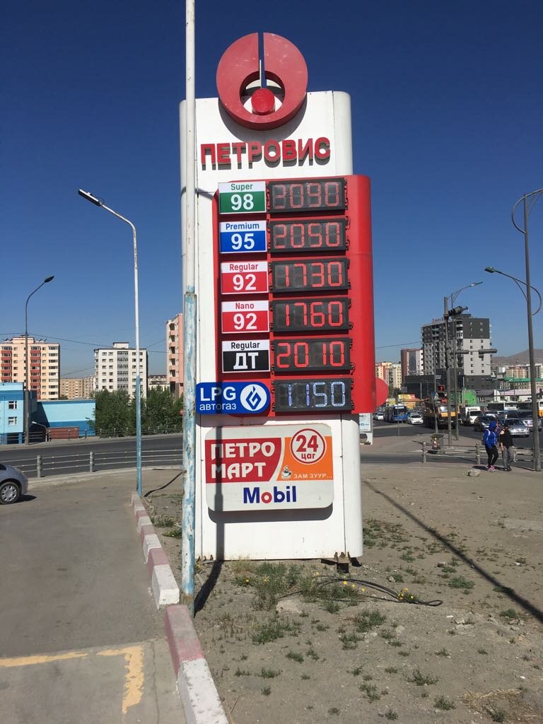 В первой статье мы писали данные о стоимости на 06.04.2018. В связи с резким ростом стоимости бензина в России мы решили опубликовать новые цены в Монголии (спойлер - они практически не изменились в национальной валюте) Сегодня Вам расскажу о стоимости автомобильного топлива в Монголии. Страна на 91% покрывает свои потребности нефтепродуктов поставками из России. Тем не менее Монголия ищет пути к снижению зависимости от импорта и проводят геологические разведки месторождений нефти. Монголия занимает 33-е место по запасам нефти среди нефтедобывающих стран стран. К 2021 г власти Монголии планируют значительно снизить долю импорта нефтепродуктов. Теперь перейдем непосредственно к стоимости автомобильного топлива в Монголии (данные на 29.05.2018, по курсу). Изменение в стоимости в национальной валюте (тугрики) составило: АИ-92 (Regular) - на 06.04.2018 - 1730 тугриков, на 29.05.2018 - 1730 тугриков - 0% АИ-95 (Premium)- на 06.04.2018 - 2050 тугриков, на 29.05.2018 - 2050 тугриков - 0% АИ-
