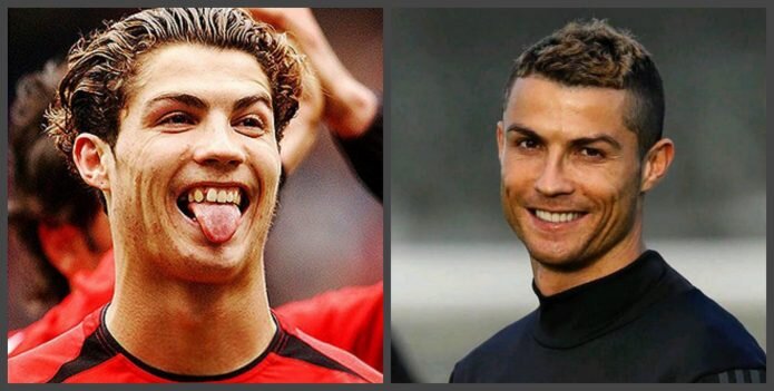Знаете ли вы, что одного из самых известных и высокооплачиваемых футболистов мира Криштиану Роналду друзья в юности дразнили из-за неровных зубов, которые сильно портили внешность будущего великого спортсмена? Взобравшись на футбольный Олимп, португалец решил всерьёз заняться своим имиджем. Посмотрите, как изменились зубы Криштиану Роналду до и после посещения стоматолога. Чтобы выровнять прикус, спортсмену пришлось долго носить металлические брекеты. Затем он обратился за помощью к дантистам, чтобы сделать композитную реставрацию зубов. Стоматологи очистили зубы Криштиану от налёта и сделали несколько процедур отбеливания. Итог впечатляющий. Если раньше Роналду часто поджимал губы, потому что стеснялся своей улыбки, то после процедур он с гордостью демонстрирует всем свою голливудскую улыбку. Источник: https://stoma.guru/zvezdy/krishtianu-ronaldu-zubyi-do-i-posle.html