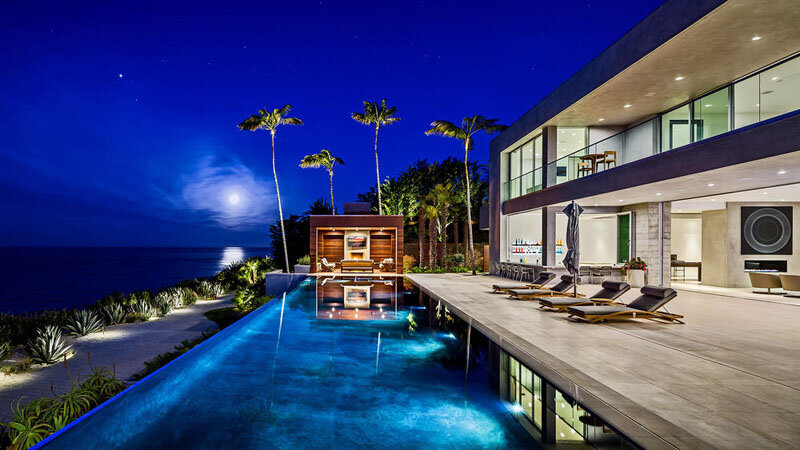 Калифорнийская архитектурная фирма Burdge & Associates, недавно завершила этот новый дом в Малибу. Ландшафтная дорожка, окруженная пальмами, ведет вас к входной двери. При входе Вас встречает гостиная, ориентированная на встроенный камин с бетонным окружением. За камином находятся бар и бильярдная. Дом был спроектирован как для внутреннего, так и для наружного проживания, с этажом открытого плана большой площади. На кухне есть большой остров для приготовления пищи и пространство для встреч с друзьями. Это вид снаружи на бар и бильярдную. Солнечная терраса имеет 67-футовый бассейн с «бесконечным краем» и впечатляющие панорамные виды на океан. Вернемся внутрь и наверх. Это вид сверху на нижний уровень. Большая спальня выходит на собственный балкон. В ванной комнате есть окно от пола до потолка с прекрасным видом на океан. В этой ванной столешница имеет скрытую подсветку. Также, в доме есть домашний кинотеатр с многоуровневыми рядами диванов, идеально подходящий д