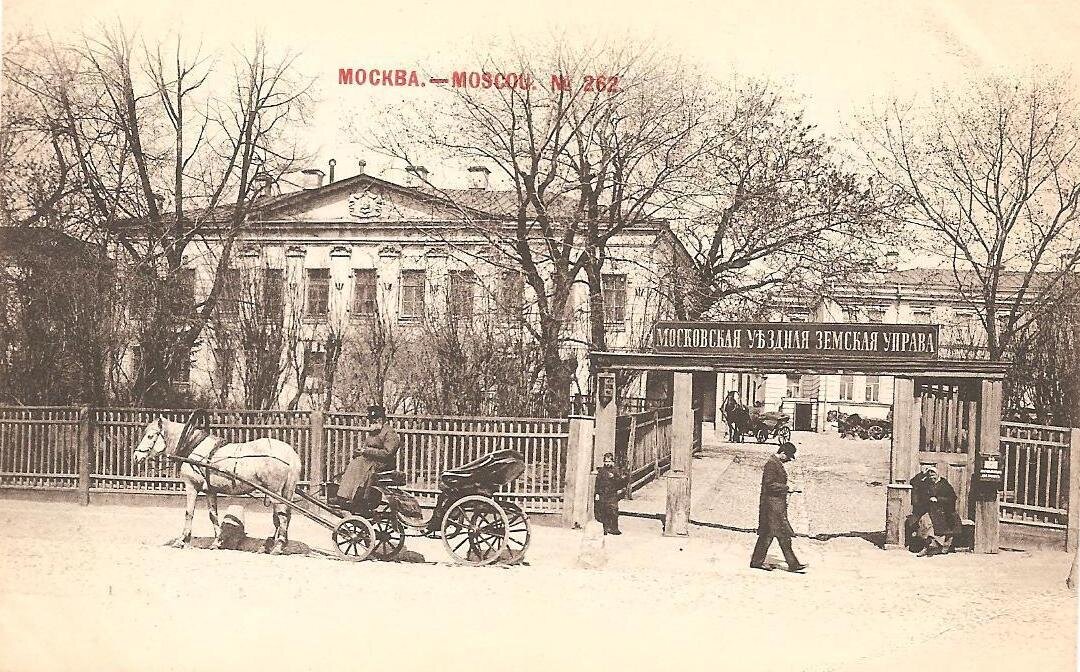 Здание Московского уездного Совета располагалось в Доме московской уездной земской управы на Сухаревской-Садовой – так эта улица называлась более ста лет назад. Это были два органа местного самоуправления, которые работали в Москве один до революции 1917 г. другой после. Московская уездная земская управа образовалась во второй половине 19 века., после земской реформы Александра 2. В земские Собрания избирались представители всех слоев населения страны на основе имущественных и сословных цензов. Собрание было местным распорядительным органом, которое избирало управы – исполнительные органы. Органы земского управления отвечали за дела местного хозяйства. Основное внимание уделялось школьной сфере (до трети всех трат) и приблизительно столько же здравоохранению. Владения на Садовой-Сухаревской, где разместилось земство, было приобретено государством в 1881 г. у купчихи Мещерской Ольги Николаевны. Кроме главного дома во владения купчихи был небольшой садик и несколько не больших хозяйст