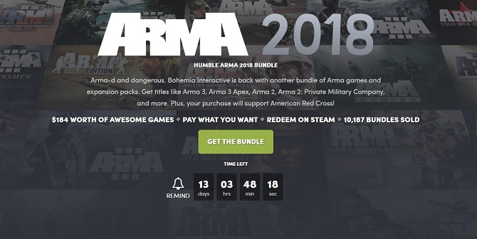 На сайте благотворительного проекта Humble Bundle проходит очередная акция Humble ARMA 2018 Bundle, по условиям которой вы сможете за благотворительный взнос приобрести игры и дополнения для PC, Mac и Linux, общая полная стоимость которых составляет $184. Отметим, что согласно вышеуказанной акции вы можете заплатить любую цену от $1 и получить ключи на скачивание приобретенных игр и дополнений из сервиса Steam. По условиям акции Humble ARMA 2018 Bundle вы можете за $1 или выше приобрести следующий контент: Если вы заплатите $15 или больше, то дополнительно к вышеуказанным играм вы получите дополнительный доступ к следующему контенту: В случае если вы заплатите $15.14 или больше, то дополнительно к вышеуказанным играм вы получите дополнительный доступ к следующему контенту: А если вы заплатите $20 или больше, то дополнительно к вышеуказанным играм вы получите дополнительный доступ к следующему контенту: По времени акция Humble ARMA 2018 Bundle продлится до 12 июня 2018 года (21:00 по