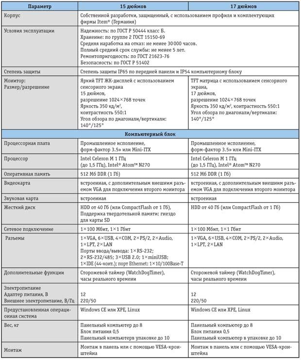 Таблица. Основные технические характеристики разработанных панельных компьютеров (с размерами мониторов 15 и 17 дюймов)