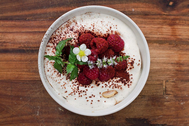 Один из самых популярных итальянских десертов в мире – тирамису, – согласно классическому рецепту, обязательно должен провести в холодильнике несколько часов. Впрочем, есть мнение, что такие ожидания мучительны и все вкусное должно съедаться немедленно, поэтому появилась и быстрая версия тирамису Сыр маскарпоне 500 г Яйцо цесарки 5 штук Ванильный сахар 30 г Сахарная пудра 100 г Молотый кофе 4 столовые ложки Палочки корицы 2 штуки Печенье савоярди 18 штук Какао-порошок 10 г Ликер «Амаретто» 60 мл Малина 250 г Мята 6 стеблей Палочки корицы 2 штуки Печенье савоярди 18 штук Какао-порошок 10 г Ликер «Амаретто» 60 мл Малина 250 г Мята 6 стеблей 1. Отделить яичные белки от желтков. Белки нужно взбивать на средней скорости миксера около трех минут, а к желткам добавить сахарную пудру и тоже взбить — и то и другое в итоге должно быть довольно плотной консистенции. 2. Маскарпоне выложить в миску, всыпать ванильный сахар и хорошо перемешать. Аккуратно ввести в сырную массу яичные же