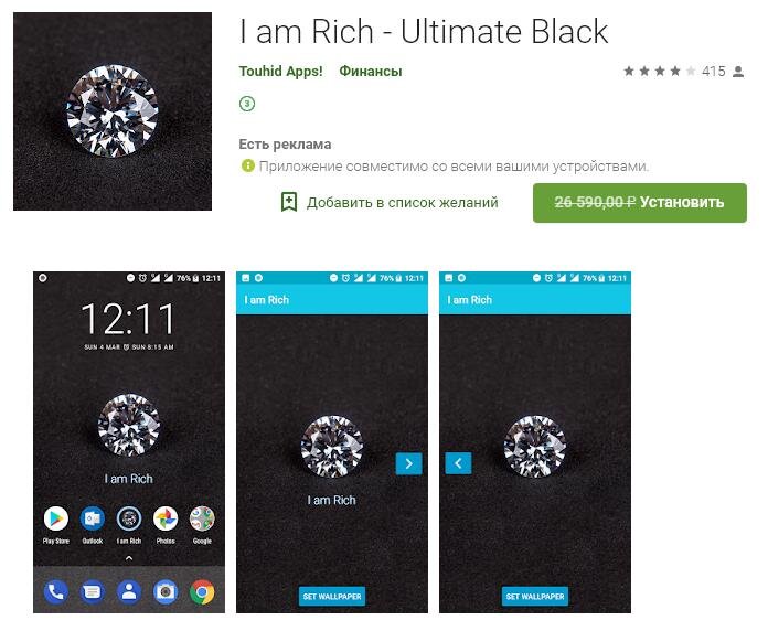 Не будем долго томить и нагнетать лишнюю интригу. На самом деле здесь всё просто. В Google Play Store иногда попадаются очень дорогие приложения, как сегодня. Кроме того, часто в магазине происходят распродажи или даже раздачи платных приложений бесплатно. В рамках промо-акций по продвижению продуктов или разработчиков. Так случилось и в этот раз. Приложение-понторез под названием I am Rich — Ultimate Black от разработчика Touhid Apps!, которое сейчас «живёт» в разделе «финансы» отдают совершенно без денег. Но через какое-то время за него снова придётся платить тем, кто захочет заиметь его на своём гаджете. На самом деле приложение не делает ничего полезного, разве что развлекательное с некоторой натяжкой. Оно просто выводит на экран фотографию бриллианта. И даёт возможность обладатели прихвастнуть перед друзьями, мол, есть у меня в смартфоне дорогущее приложение, не раск