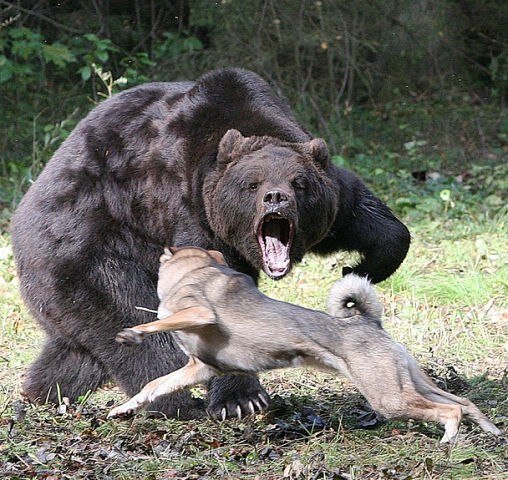 Есть два способа охоты на медведя, в которых задействованы лайки. Суть первого в том, что собаку используют для поиска берлоги или для выманивания медведя из нее. Второй способ предполагает то, что собака хватает зверя за наиболее восприимчивое к боли место, таким образом заставив его двигаться медленнее. На охоте на медведя роль собак крайне важна. Поэтому выделяют настоящих лаек-медвежатниц, или «бойцовых», и лаек-берложниц. Лайки, которые отлично «работают» по медведю, когда он не в берлоге, встречаются весьма нечасто. Это скорее всего объясняется тем, что и настоящих охотников на этого хищника мало. Во время охоты на медведя лайки-медвежатницы должны ловко двигаться, обладать смелостью, быть достаточно злы и при этом осторожны. Традиционно это небольшие, но крепкие собаки с превосходно натренированной мускулатурой. После того как берлога обнаружена, можно начинать охоту на медведя, либо загнав зверя, либо брать его на берлоге. На берлоге рекомендуется охотиться втроем: двое с ру