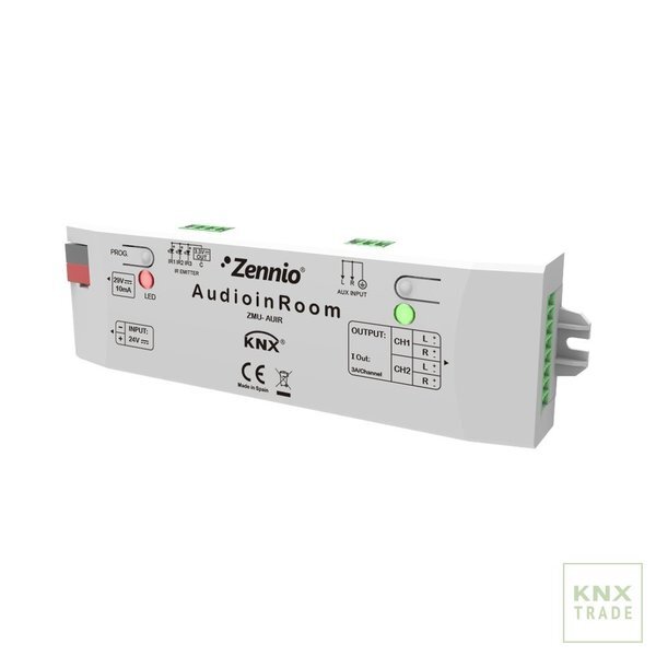 AudioInRoom - новая аудио система KNX от Zennio, которая позволяет проигрывать музыку со смартфона через Bluetooth или через дополнительный аудио вход, 2 стерео канала 20 Вт. AudioInRoom (артикул: ZMU-AUIR) - идеальный аудио-контроллер для гостиничных номеров, который позволяет гостям воспроизводить музыку со своего смартфона через соединение Bluetooth или со вспомогательного аудиовхода (например, телевизора). Он имеет два стерео-канала, так что вы можете включать / отключать, отключать звук или регулировать громкость в двух независимых областях. Соединение Bluetooth ограничено паролем, чтобы убедиться, что гость подключается к аудиосистеме в своей комнате.