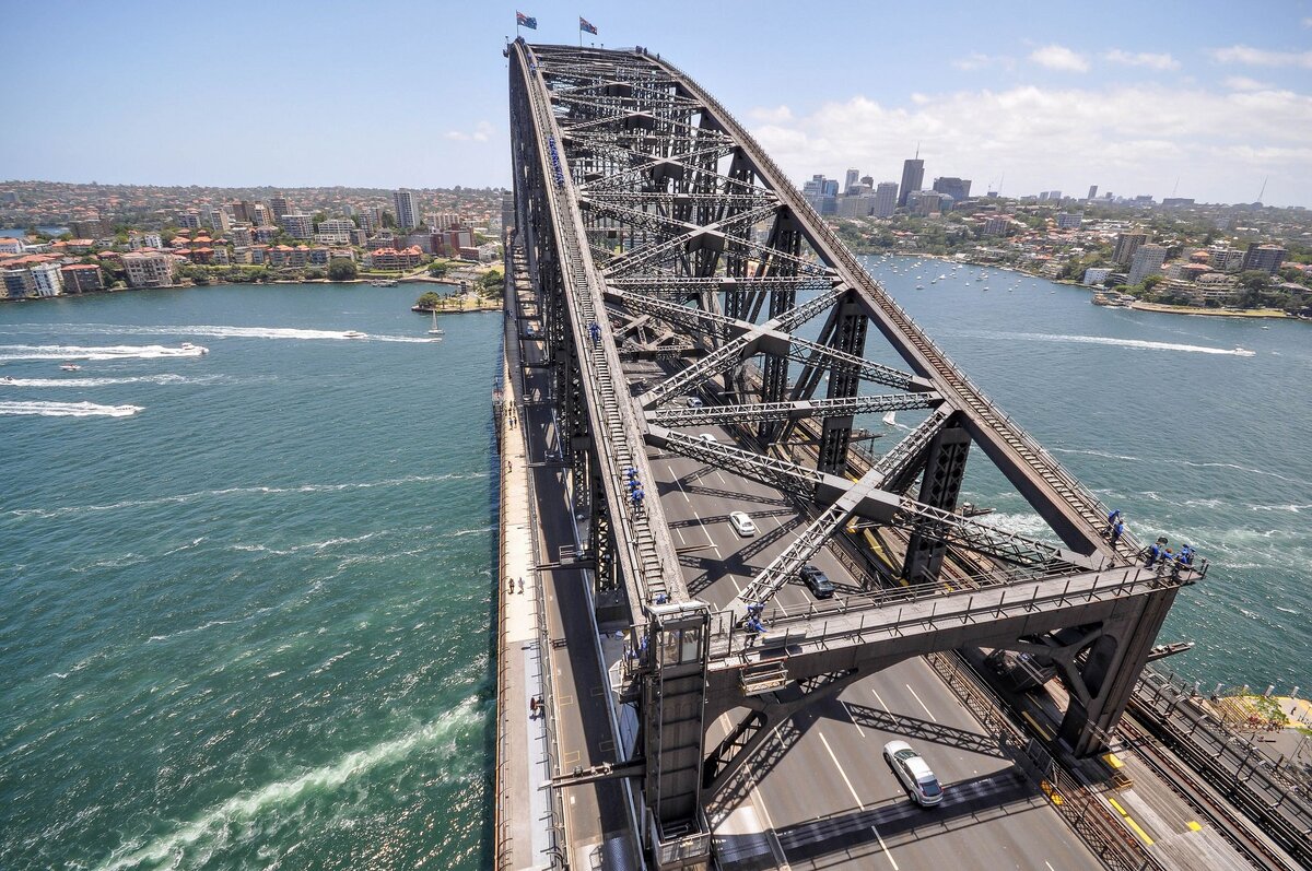 Описание объекта: Ширина моста - 49 метров, это самый широкий мост в мире в своей категории. Здесь пролегает восемь полос движения, пешеходный переход, дорожка для велосипедистов и двойная железная дорога. Две части арки моста одновременно строили на двух берегах. Каждую удерживают сзади 128 кабелей. Стальные части моста изготовляли на фабриках, транспортировали под мост баржами и оттуда поднимали с помощью двух 580 - тонных электрических двигателей. Дорогу, которая пролегает на мосту, назвали в честь архитектора Джона Джоба Крю Бредфилд, по проекту которого построен мост - дорога Бредфилд. Высота арки моста достигает 134 метров над водами порта. Арку моста, изготовленную из серой стали, покрасили 272 тыс. литров серой краски. Поверхность, которую нужно было покрасить, можно сравнить с поверхностью 60 спортивных стадионов. Вес конструкции моста - 52 тыс. 800 тонн. На строительство моста использовали: 122 тыс. куб. метров камня, 95 тыс. куб. метров бетона, 17 тыс. куб. метров гранита
