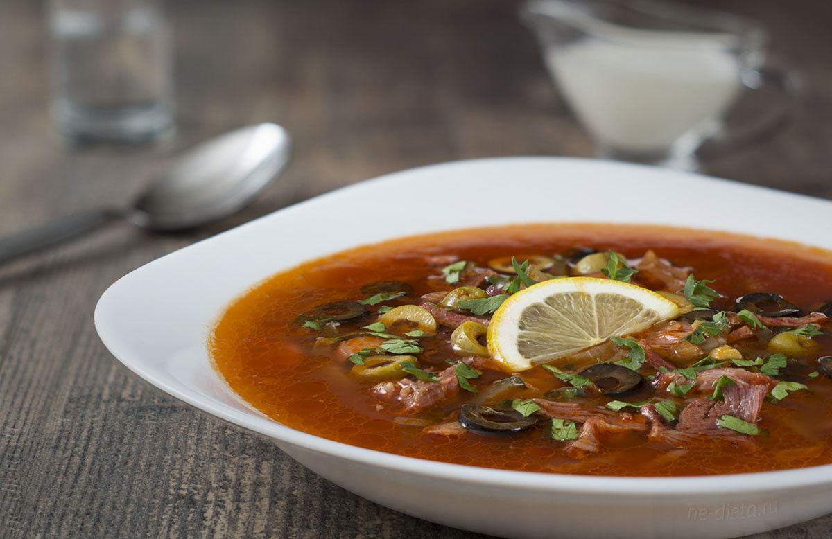 маслины или оливки ; Способ приготовления: 1. Ставим варить мясо. Бульон для солянки правильный – должен быть крепкий, насыщенный. Но, если для вас это слишком – то можно сварить бульон из небольшого кусочка с косточкой, а такой крепкий бульон разбавить водой.