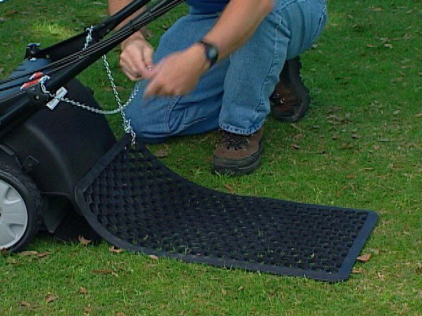 Я все ратую за плоски на газоне. Не потому, что я такой энтузиаст барабанных газонокосилок, а потому, то это очень эффектно и красиво. Газон с полосками сразу приобретает законченную форму. Классно выглядит. Не только с полосками, конечно. Например, обработка кромок - совершенно обязательна, так как делает газон аккуратным и придает ему законченный вид. Именно газона, а не дикие лужайки с подстриженной травой. А как сделать полоски, если конструкция газонокосилки не предусматривает опорных валиков, которые полоски, собственно и создают. А вот так - прицепив к газонокосилке обычный дверной половичок. Отличный метод, между прочим. Единственное условие - половик должен быть достаточно тяжелым, чтобы пригибать траву. Еще один нюанс - стрижется так только очень короткая трава - ее обрезки остаются на месте.