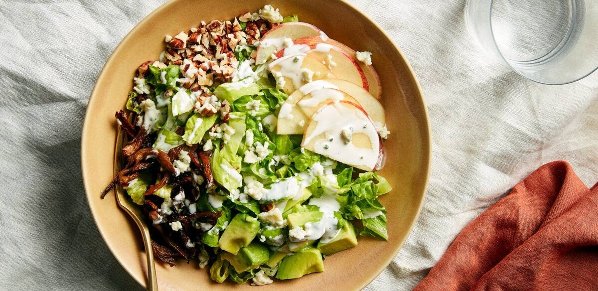 Грибные чипсы в этом вегетарианском рецепте заменяют хрустящий бекон традиционного кобб-салата. Ингредиенты 2 перышка зеленого лука 3 ст.л. майонеза 250 гр вешенок 1/4 ст. пахты или легких сливок 1/2 ст.л. сахара 1/4 ст. рубленых орехов пекан или грецких орехов 2 пучка салата романо 1 ч.л. морской соли 1 яблоко 1 авокадо раскрошенный голубой сыр 30 гр раскрошенного голубого сыра 3 ст.л. греческого йогурта 1/2 ч.л. паприки Приготовление 1. Разогрейте духовку до 220 ° C. Удалите ножки грибов и нарежьте шляпки на полусантиметрове полоски. Разрезать пучок салата романо вдоль пополам и тщательно промыть, затем тонко нарезать поперек, удаляя жесткие стебли. Яблоко очистить от сердцевины и тонко нарезать. Лук тонко нарезать. 2. Пожарить грибы Выложить противень фольгой. В большой миске смешать соль с паприкой и 1,5 столовыми ложками масла. Добавьте грибы в миску с пряным маслом и перемешайте, затем перенесите на половину подготовленного листа для выпечки. Уложить в один слой и обжарить д