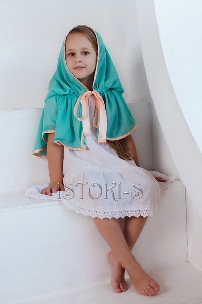 Бирюзовый платок Бирюзовый платок Karina для девочки из однотонного шелкового шифона, отделан контрастной персиковой атласной косой бейкой и имеет в качестве завязок широкие персиковые атласные ленты. Дизайнерский нарядный платочек станет лучшим подарком к лету для маленькой принцессы. Какой платок выбрать дочери на лето? Выбрать платок дочери на лето можно легко, если руководствоваться при выборе тем, что платочек должен быть изготовлен из натурального материала, легкий и, безусловно красивый. Дизайнерский бирюзовый платок Karina соответствует всем вышеперечисленным требованиям и потому, безусловно, станет самым лучшим выбором. Бирюзовый платок Karina для девочки сможет стать Вашим в тот же день, при его покупке в нашей лавке! ХАРАКТЕРИСТИКИАртикул: K-003