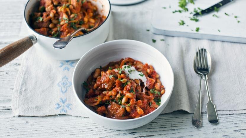 Мясо с овощами и большим количеством трав, заряжает энергией на целый день. Это кладезь белков,углеводов и витаминов. Поделюсь с вами 2 рецептами очень вкусных и полезных блюд. Свинина с фасолью. растительное масло 1 луковица 250 г филе свиной вырезки,порезаной по 2 см 150г телятины позрезаной по 2 см 2 зубчика чеснока, измельченные 2 ч.л. паприки ½ ч.л. порошка чили 400 г помидоров 2 банки консервированой фасоль, осушенной и промытой 2 столовые ложки томатного пюре 2 ч.л.горчицы 400мл куриного бульона зелень петрушки 4 столовые ложки не жирной сметаны соль и свежемолотый черный перец Приготовление В большой широкой посуде разогреть масло и слегка припустить лук. Добавить свинину и телятину, приправить перцем и варить в течение двух минут, постоянно помешивая. Добавьте чеснок, паприку и порошок чили и варите в течение нескольких секунд, помешивая. Покладите помидоры и фасоль в кастрюлю и покладите томатное пюре и горчицу. Налейте бульон Варите в течение 20-25 минут, периодическ