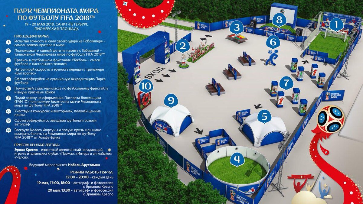 Уникальный парк футбола, полностью посвящённый тематике этого вида спорта, открылся накануне в северной столице Российской Федерации. Мероприятие проходит в рамках приближающегося Чемпионата мира по футболу 2018 года. Интерактивный парк – это передвижной фестиваль, который по очереди открывается в российских городах, принимающих матчи мундиаля. На торжественной церемонии открытия парка в Санкт-Петербурге присутствовали председатель оргкомитета ЧМ-2018 Аркадий Дворкович, а также экс-игрок сборной России Дмитрий Сычёв. Сегодня в парке пройдёт афтограф- и фотосессия с Эрнаном Креспо, бывшим аргентинским футболистом, включённым в состав 125 лучших игроков мира. Ставьте лайк материалу, а также не забывайте подписываться на наш канал!