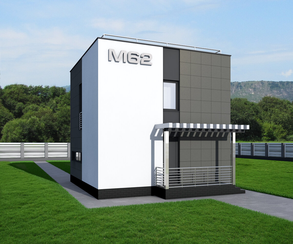 В последнее время в обществе появилась потребность в строительстве загородных домов небольшой площади. Не отставая от моды мы предлагаем проект небольшого, стильного, современного, молодёжного дома. При общей площади дома 62 квадратных метров на первом этаже комфортно разместились входной тамбур, котельная, прихожая, гардероб верхней одежды, гостевой туалет, общее пространство гостиной-кухни-столовой. Из гостиной-кухни-столовой через большое панорамное окно есть выход на открытую летнюю веранду. На втором этаже разместились комната хозяев дома, детская комната, ванная комната и небольшое хозяйственное помещение. Все помещения объединены коридором с естественным светом. Фасады частично отделаны штукатуркой и окрашены в белый и тёмно-серый цвет, а частично отделаны термопанелями с облицовкой керамогранитом. Козырьки входного крыльца и открытой веранды покрыты литым прозрачным поликарбонатом и защищают от осадков. У кухонного гарнитура вместо кухонного фартука встроено длинное гориз