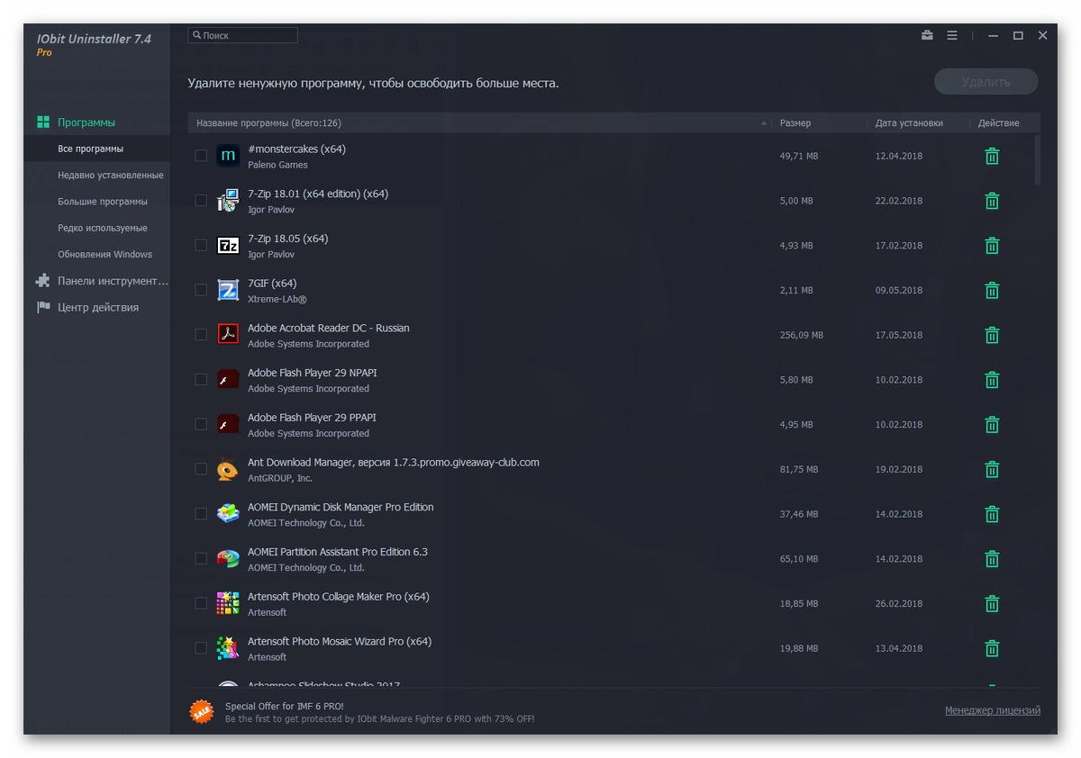 IObit Uninstaller небольшая программа для удаления ненужных программ и папок. Она находит все установленные программы и сортирует их, а для удаления какой-то программы остается лишь щелкнуть мышью! Опции «глубокая проверка» и «принудительное удаление» позволяют полностью удалить даже самые неподатливые панели инструментов. IObit Uninstaller — переносимая, удобная и эффективная программа. Возможности программы Для получения лицензии нужно проделать следующие шаги: 1) Скачать программу 2) Установить и запустить программу 3) Внизу справа выбрать пункт ввести код и скопировать код в окно 0F7E2-48D5F-7FB10-2C7B7 Если вы хотите поддержать канал материально для улучшения качества статей и мотивации автора теперь есть такая возможность. Счёт Qiwi +79196656515 для пожертвований TOP10 самых больших пожертвований будет в каждой статье поэтому пишите в комментарии к переводу ваш ник или что вашей душе угодно (в пределах приличия:) Подписывайтесь на канал чтобы быть