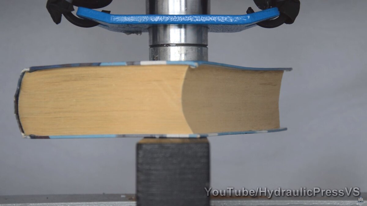 Наверное, вы пробовали сложить лист бумаги несколько раз. рано или поздно это становится невозможно. Чтобы перегнуть его в очередной раз нужно столько сил, сколько уже нет, да и площадь листа уменьшается, что тоже усложняет задачу. Словом, бумага - это достаточно крепкая вещь. Но давайте проведём очередной эксперимент. Что же будет, если бумагу положить под мощный гидравлический пресс. Толстенную книгу, страниц, наверное, за 1000. Сможет лишь мощь металла и жидкостей сравниться с прочностью бумаги. Продырявит ли пресс книгу насквозь? Станет ли бумага снова деревом? Поначалу видно, что пресс достаточно уверенно сдавливает и уплотняет листы, деформируется обложка книги, начинает выгибаться. Но затем слышно, как механизм пресса начинает срабатывать всё неувереннее. В конце концов деформировать удалось примерно половину книги. Но впереди второй раунд - ещё более интересный. Сдавливание увеличили. Страницы буквально начинают выползать из книги. Они выдавливаются. Но в итоге книга не выдержи