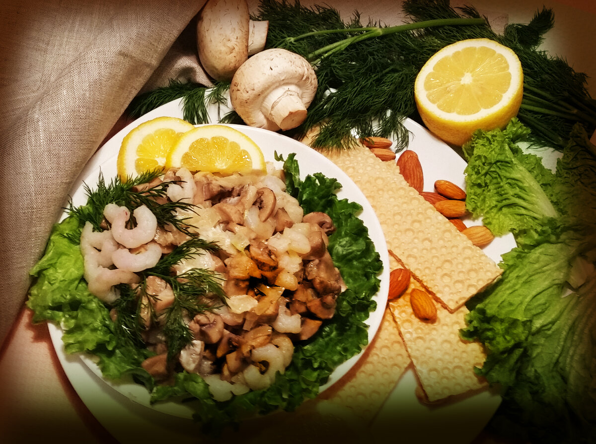 ПОШАГОВЫЙ ФОТО-РЕЦЕПТ! ОЧЕНЬ вкусно, быстро, просто! Вкус этого блюда настолько хорош и необычен, что не описать словами! ПОТРЕБУЕТСЯ: 1. Очищенные вареные креветки ( можно салатные)-300 гр 2. Шампиньоны свежие -300 гр. 3. Лук -2 средних шт. 4. Растительное мало для обжарки 5. Свежая зелень 6. Майонез, лимон по желанию ПРИГОТОВЛЕНИЕ: 1. Лук порезать кубиками, поджарить до золотистого цвета и отложить отдельно. 2. Шампиньоны порезать и обжарить на небольшом количестве растительного масла. Можно жарить даже вовсе без масла, если предпочитаете нежирную пищу. Посолить. Отложить отдельно. 3. Креветки варить в подсоленной кипящей воде 3-4 минуты, добавив 2 кружочка лимона. Можно использовать готовые замороженные вареные креветки "Салатные" 4. Соединить креветки, лук и грибы, перемешать. По желанию можно заправить майонезом и добавить зелень. Но и без майонеза тоже ОЧЕНЬ ВКУСНО! ПРИЯТНОГО АППЕТИТА! Если Вам понравилось блюдо то, чтобы не потерять рецепт, сделайте репост в своих со