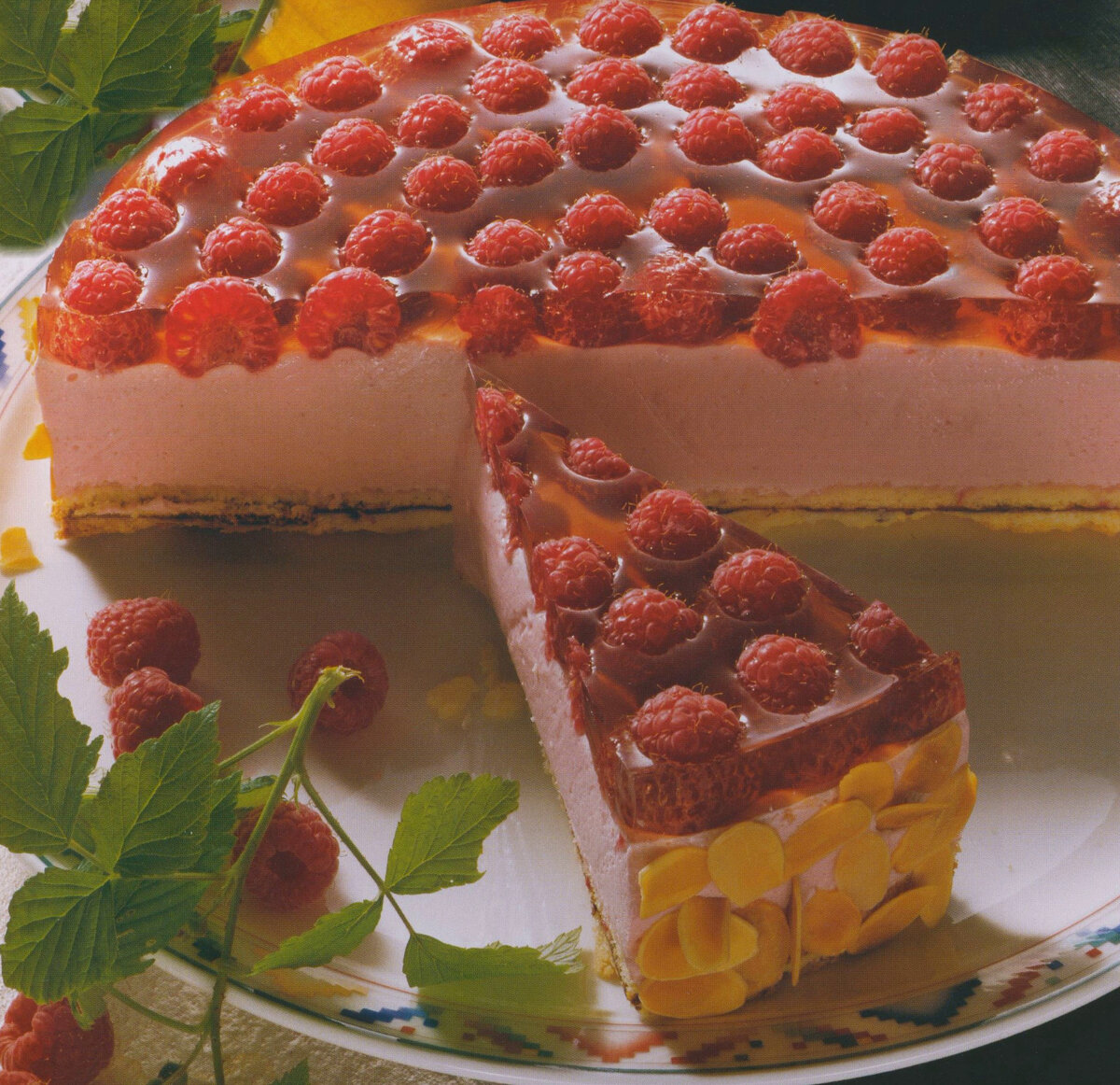 Ингредиенты: Для бисквитного теста: 2 яйца, 50 гр. сахара, 1 пакетик ванильного сахара, щепотка соли, 60 гр. муки, 1/4 чайной ложки разрыхлителя для теста, масло для смазывания формы Для песочного теста: 120 гр. муки, 1/2 чайной ложки разрыхлителя для теста, щепотка соли, 60 гр. сливочного масла, 2 столовые ложки сахара, 1 желток, 1 пакетик ванильного сахара, масло для смазывания формы Для начинки и украшения: 40 гр. шоколада, 700 гр. свежей или замороженной малины, 125 гр. сахара, 350 гр. йогурта без добавок, 4 столовые ложки лимонного сока, 9 пластинок белого желатина, 400 мл. сливок, 50 гр. миндальных хлопьев Для желе: 3 столовые ложки красной смородины, 1 пакетик прозрачного желе для торта, 2 столовые ложки сахара Способ приготовления: Для приготовления бисквитного теста необходимо взбить яйца с 1 столовой ложкой холодной воды, добавить сахар, ванильный сахар и соль. Хорошо всё перемешать. Затем объединить муку и разрыхлитель для теста. Высыпать их в яичную массу и размешать. Подг
