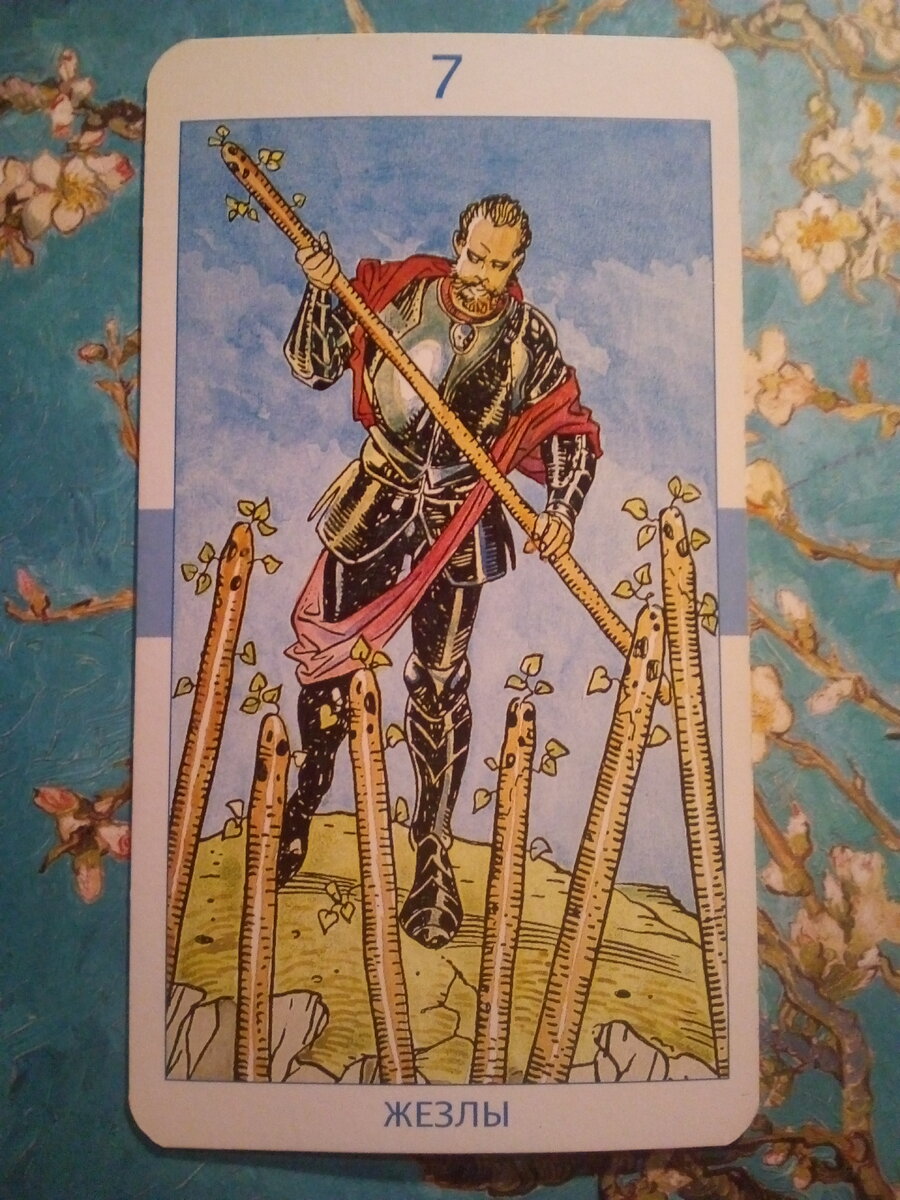 7 жезлов символизирует силу человека, который решительно идет навстречу своей судьбе. Карта также олицетворяет независимость убеждений, верность своим суждениям и уверенность в себе.