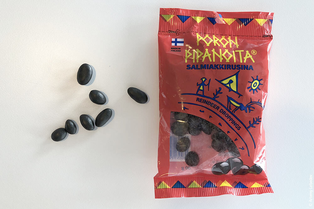 В Финляндии продается подсоленный изюм в сахаре со вкусом лакрицы, который официально на обратной стороне переведен на русский как "катышки северного оленя".