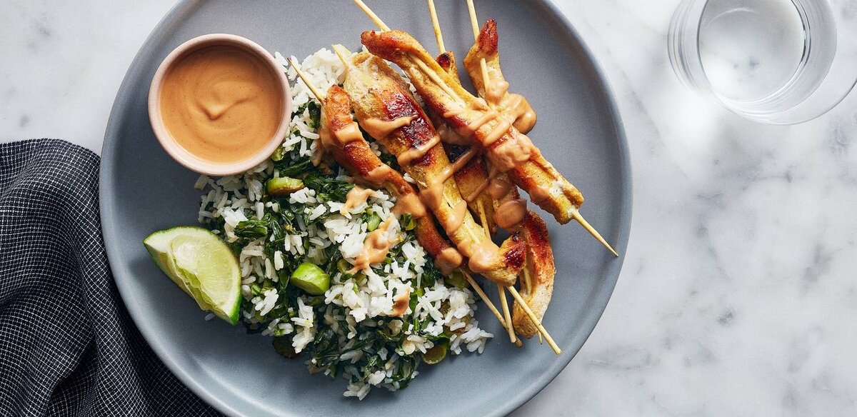 Это блюдо индонезийской кухни, обычно его жарят на шпажках на углях. Здесь мы тоже будем жарить на шпажках и подавать с имбирным рисом и арахисовым соусом Ингредиенты 1/4 ч.л. чесночного порошка 3/4 ст. риса 2 стебля зеленого лука 3-4 столовых ложки соевого соуса 1/8 ч.л. молотого имбиря 1 ст.л. уксуса (лучше рисового, либо лимонного сока) 1/8 ч.л. молотого кориандра 200 гр шпината 1 ст.л. кунжутного масла 1/2 ч.л.карри 10 деревянных шпажек 2 куриные грудки 3-4 ст.л арахисового масла свежий корень имбиря (2х2 см) 1 лайм Приготовление Счистите кожицу с имбиря, затем поместите весь корень в небольшую кастрюлю. Добавьте рис, 1,25 стакана воды и 1/4 чайной ложки соли и доведите до кипения на сильном огне. Размешайте один раз, затем уменьшите огонь до среднего минимума, накройте кастрюлю и тушите до полного испарения воды, 10-12 минут. Снять кастрюлю с огня и дайте постоять еще под крышкой в течение 10 минут. Перемешать вилкой, затем снова накрыть до шага 5. 2. Пока рис варится, промойте