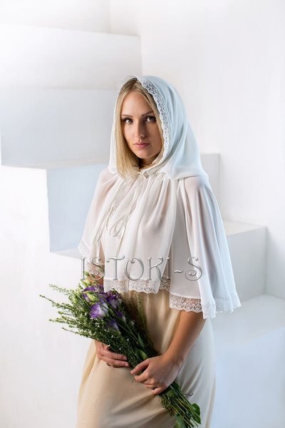 Платок молочного цвета Carolina в храм Платок молочного цвета Carolina в храм создан из креп-шифона, эта ткань является легкой, благодаря чему в жару летом Вам не будет жарко. Отделка по переднему периметру и вокруг лица кружевом, выполненным вышивкой на фатине, позволит выглядеть женственно, а застежка в виде атласной тесьмы будет очень удобна. Может ли платок помочь спасению? Платок для спасения души, конечно не пригоден. Однако по писанию при совершении молитвы не только в храме, но и дома женщина должна быть с покрытой головой. Поэтому необходимо об этом помнить и надевать платок при домашней молитве. Платок молочного цвета Carolina представленный в нашей лавке на этой странице подойдет не только для молитвы в храме, но и дома, а после Вашего заказа будет доставлен максимально быстро по указанному в заказе адресу! ХАРАКТЕРИСТИКИАртикул: K-004