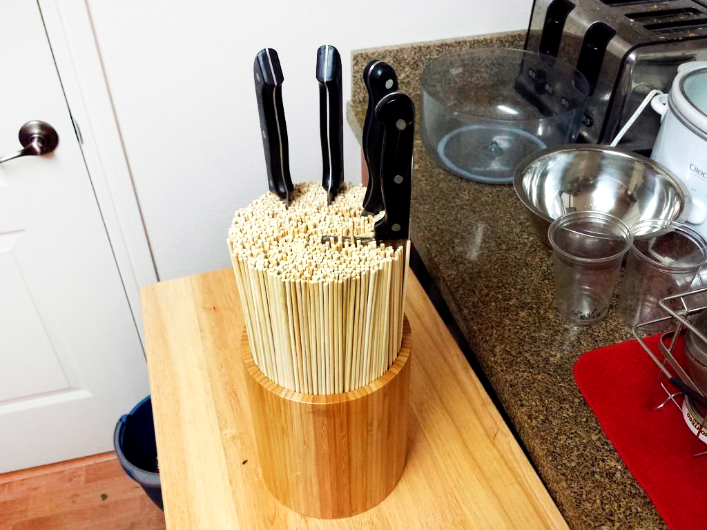 Всегда приятно, когда на кухни много полезных мелочей, которые не только удобны в использовании но и радуют глаз. Самое интересное, что сделать многие из них совсем не сложно из подручных материалов и мусора. 1. Подставка для ножей Сделать ее легко из деревянных шпажек. Вставьте в банку, стакан или другую емкость шпажки, так чтобы они стояли довольно плотно. Теперь можно вставлять в них ножи. Такая подставка очень удобно и аккуратно смотрится на кухне. Не забудьте иногда сливать стекшую воду, а лучше сделайте дырочки внизу банки. 2. Держатель для досок. Доски все время мешаются на столе, в отделения для посуды они не влезают, а в полках занимают слишком много места. Отличная идея хранить их в дверке ящиков. 3. Подставка для приборов Можно придумать множество разных вариантов подставок. Самый простой, но вполне красивый это подставка из банок. 4. Доска для специй. Прикрепите к полке или другой удобной поверхности железную доску. А на контейнеры для специй приклейте термоклеем магни