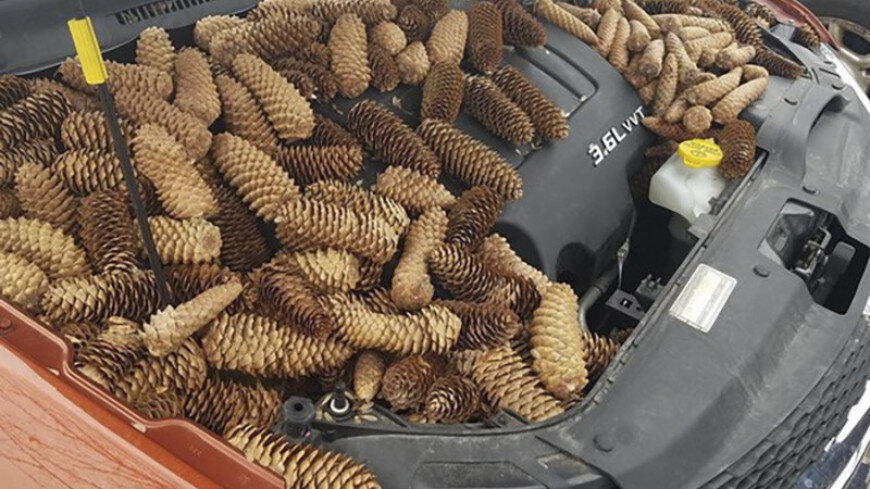 Столько шишек белка натаскала за зиму. А весной они о жары начали расширяться и заблокировали двигатель. Когда шишки убрали, машина завелась.
