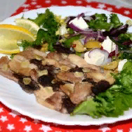 Очень вкусное и эффектное блюдо, которое особенно красивым получается у тех, кто хорошо умеет работать с филировочным ножом. Чтобы приготовить его, нож должен быть очень острым, поэтому берегите руки и не отвлекайтесь. Вам потребуются: Способ приготовления: Для того чтобы проще было нарезать мясо и птицу очень тонкими ломтиками, их нужно предварительно охладить, даже можно слегка заморозить в морозильной камере или на балконе. Нарезаем тонкими ломтиками телятину, откладываем в отдельную посуду. Так же поступаем со свининой и курицей. Лист фольги нужно смазать растительным маслом. Чтобы весь лист покрыть маслом, лучше всего использовать силиконовую кулинарную кисть: так масла потребуется меньше. Теперь начинаем выкладывать на фольгу нашу «черепицу», чередуя ломтики телятины, курицы и свинины. Сверху мясо можно присолить, сбрызнуть лимонным соком, украсить чесноком или кружочками помидоров, или же посыпать сухой зеленью. Это уже каждая хозяйка может выбрать на свой вкус. Заворачиваем
