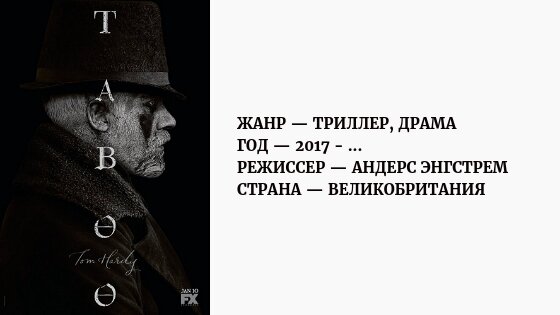 Сериал "Табу" Мы с тобой, мой друг, живём в эпоху торжества декора над здравым смыслом, над настоящими чувствами, над любовью, талантом и жизнью вообще. Декор заменит и заслонит собой всё это. Посмотри заполонившие все "свадебные" фотосессии - в которых люди на фото это только еще два элемента декора, и не самые важные при этом: украшенный стул или винтажная [цензура] на столе намного важнее этих ничего не значащих "персонажей" фотосессии. Посмотри "фуд-фото" наших "фуд-фотографов", заваленные винтажным хламом так, что хочется спросить: а собственно "фуд"-то где ? Посмотри на фотографии "квартир мечты" - идеально декорированных, без малейших признаков того, что в них живут люди (или хотя бы бывают в них, иногда). То же самое касается не только свадебной фотографии, в которой все свихнулись от декора, но и кино. На свет появляются фильмы и сериалы, единственное достоинство которых это декор - драпировки, предметы, досочки, свечечки, туманчик, и выпущенные кишки, и больше ничего в этих