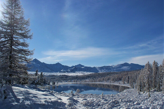С вершины перевала открывается вид на удивительной красоты (на снимке): озеро Кеделю! Здесь же находится место поклонения алтайцев их духам. Они вяжут на ветви деревьев длинные полоски ткани и складывают из камней небольшие пирамидки. Над каждой ленточкой они шепчут свои чаяния в надежде на то, что духи ветра, играющие с этими полосками ткани, унесут их к Тенгри, верховному божеству. Очень красивое и доброе верование...