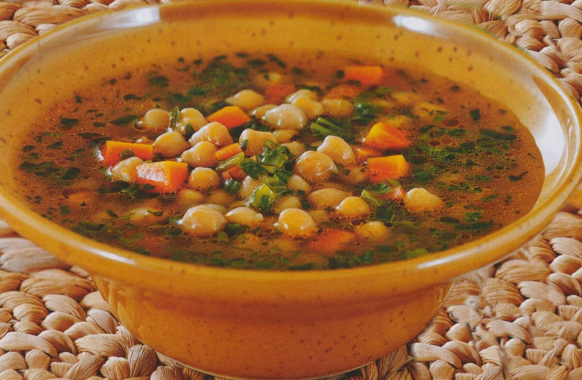 Ингредиенты: 2 стакана нута, 2 моркови, 1 пучок зелёного лука, 1 пучок кинзы, 4 столовые ложки оливкового масла, 1 лимон, соль по вкусу, молотый чёрный перец Способ приготовления: Нут вымыть и залить холодной водой и оставить на 6-8 часов. После истечения времени воду вылить и налить в кастрюлю 1,5 литра воды, выложить в неё нут и довести до кипения. Затем варить нут до готовности приблизительно 40 минут. Он должен стать мягким. Морковь вымыть и почистить, порезать небольшими кубиками. Лук вымыть, высушить и порезать тонкими колечками. Кинзу вымыть, обсушить, мелко нарезать. В сковороду вылить 3 столовые ложки оливкового масла и обжарить на нём лук, морковь в течение нескольких минут. Лимон вымыть, выжать из него сок. Дополнить овощами кастрюлю с нутом, добавить соль, молотый чёрный перец и варить на слабой мощности плиты приблизительно 10 минут. В готовый суп добавить лимонный сок вместе с оставшимся оливковым маслом. Разлить суп по глубоким тарелкам и украсить мелко нарезанной кинз
