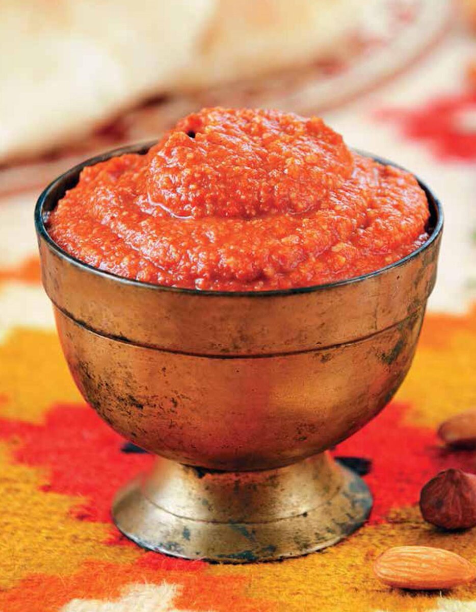 Время приготовления: 2,5 часа Ингредиенты: 3 средних помидора 1 большой красный сладкий перец 4 зубчика чеснока 4 ст. л. оливкового масла 2 ломтика подсушенного белого хлеба 1 стакан очищенного миндаля 1 стакан очищенного фундука 0,25 ч. л. острого красного перца 1 ч. л. молотой паприки 1 ст. л. красного винного уксуса соль по вкусу Приготовление: 1. Помидоры и перец вымыть, обсушить. 2. Выложить овощи вместе с зубчиками чеснока на противень и запекать в течение 25–30 минут при 250 °C. 3. Достать овощи из духовки, переложить в миску, прикрыть крышкой и оставить на 1 час, после чего снять с них кожицу. 4. В сковороде разогреть 1 ст. ложку оливкового масла. Хлеб нарезать кубиками, обжарить до золотистого цвета. 5. Снять сухарики со сковороды, долить в неё 1 ст. ложку масла и обжарить на нём миндаль и фундук. 6. В блендере измельчить печёные овощи до состояния пюре, добавить сухарики и орехи. 7. Продолжая взбивать, подсолить, добавить красный перец, паприку, уксус и оставшееся оливковое м