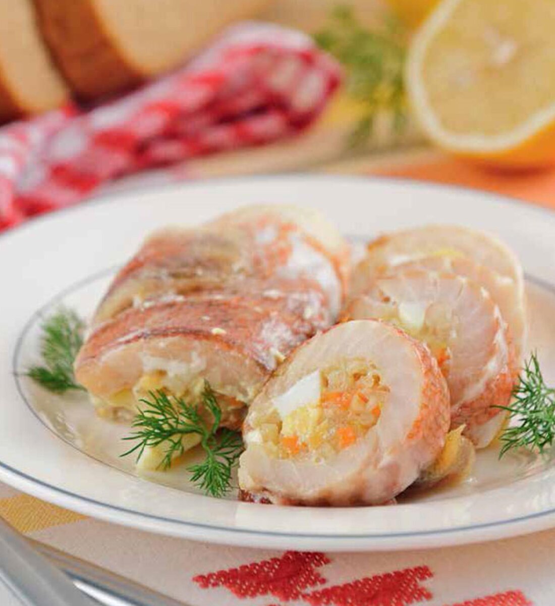 Время приготовления: 1 час 10 мин Ингредиенты: 1 кг филе окуня 2 средние моркови 2 яйца 2 крупные луковицы 2 ст. л. растительного масла 10 г желатина 1 л воды соль и перец по вкусу Калорийность: 99 ккал Приготовление: 1. Филе промыть, обсушить, слегка отбить, посолить и поперчить по вкусу. 2. Морковь вымыть, очистить, отварить до готовности (25–30 минут). 3. Яйца сварить вкрутую, остудить, очистить. Лук очистить, мелко нарезать. 4. В сковороде разогреть половину растительного масла, спассеровать на нём лук до прозрачности. 5. Отваренную морковь нарезать брусочками, яйца – дольками. Желатин залить водой согласно инструкции на упаковке, дать набухнуть. 6. Филе уложить на пищевую плёнку кожей вниз. В середину каждого куска выложить морковь, лук, яйца и желатин. Свернуть рыбу с начинкой рулетом, перевязать кулинарной нитью и отваривать в подсоленной воде 25 минут. 7. Готовый рулет охладить под лёгким прессом, нарезать на ломтики и подать к столу. Всем приятного аппетита!! Благодарим за вни