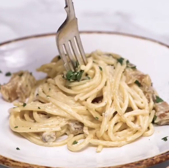 Этот рецепт для тех, кому без разницы "карбонара" или "болоньезе", а главное, чтобы было просто, сытно и вкусно! Купи пачку спагетти, немного петрушки, репчатый лук, чеснок, сливки, любые грибы(например, шампиньоны), также возьми на свой вкус бекон, сало или шпик. Если ты совсем гурман, купи твёрдый сыр (например, пармезан), чтобы завершить приготовление, как профессиональный повар. Приступаем к приготовлению вкуснятины. 1. Порежь и измельчи репчатый лук и чеснок, разогрей сковороду, налей масло и отправь жариться до золотистого цвета. Нарежь мясной ингредиент на небольшие кубики и отставь в сторонку. Когда лук и чеснок станут нужного цвета, отправь уже нарезанные грибочки к ним и перемешай. 2. На другой плитке поставь ёмкость с водой, а когда она закипит, сбрось туда свои спагетти и вари, как написано на упаковке, желательно до состояния "al dente"(от итал. al dente — на зубок). 4. Пока варятся спагетти, скинь мясной ингредиент к грибам с луком и чесноком, перемешай, влей сливки и сно