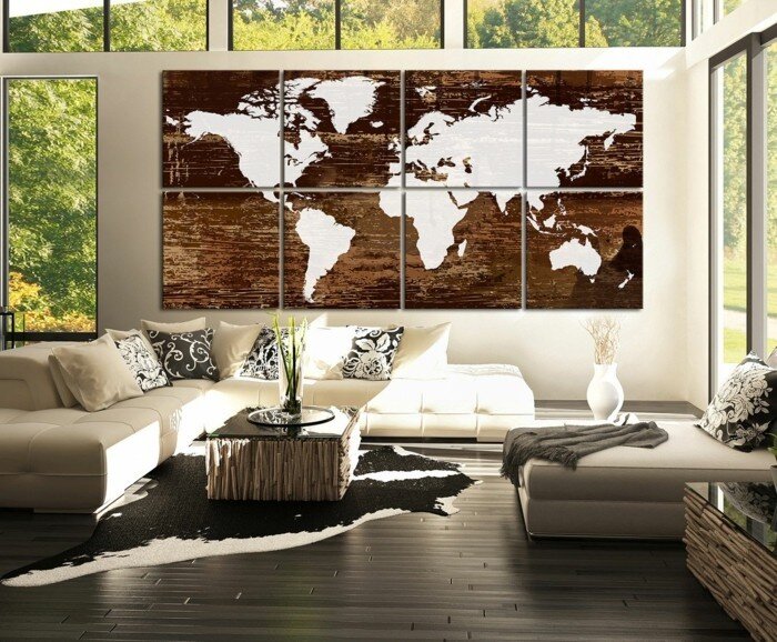 Если вы хотите, чтобы все смотрели на стены комнаты, то вы должны мыслить творчески. Потому что стены заметно влияют на атмосферу комнаты. Карты мира давно стали хорошей альтернативой дизайну стен, и сегодня они пользуются большой популярностью. Они оживляют пространство, придавая ему привлекательность, они также делают его очень практичным. Карта мира напоминает о старых путешествиях, и также способствует новым планам и мечтам. Настолько декоративными и информативными являются современные карты мира! Будь то большие нетканые обои или минималистские холсты, карты мира можно найти в каждой комнате. Если вы также хотите сделать свои стены необычными, тогда позвольте себе вдохновиться, и внести стену с картой мира в интерьер! Какие у вас есть варианты? Много лет назад плакаты с картой мира были развешаны в основном детской комнате. Сегодня вы вносите в неё больше декоративной ценности, поэтому вы полагаетесь на неё больше как на великолепное украшение стен. Поэтому не смотрите на кар