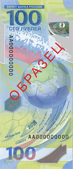 Первый заместитель председателя Банка России Ольга Скоробогатова и генеральный директор Гознака Аркадий Трачук представили 100-рублевую банкноту из пластика к чемпионату мира по футболу 2018 года, который состоится в России. Ограниченный тираж новой банкноты составит 20 миллионов экземпляров. О планах выпуска памятной банкноты к чемпионату Банк России сообщил в ноябре 2017 года. Летом прошлого года Центробанк выпустил в обращение четыре памятные серебряные монеты номиналом 3 рубля, а также памятную монету из недрагоценных металлов номиналом 25 рублей в обычном и специальном исполнении. Так, первый в истории чемпионат мира по футболу на территории Российской Феерации будет проходить с 14 июня по 15 июля 2018 года. Матчи турнира состоятся в Москве, Калининграде, Санкт-Петербурге, Волгограде, Казани, Нижнем Новгороде, Самаре, Саранске, Ростове-на-Дону, Екатеринбурге и Сочи.