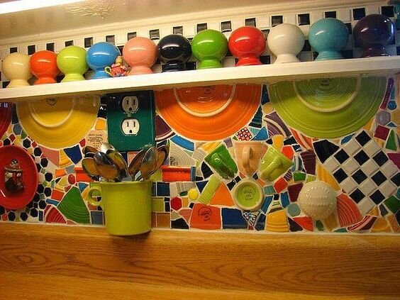 Кухонный фартук из мозаики или плитки есть у многих. Но далеко не у каждого такой фартук — это искусство. Взгляните на этот фартук из плитки, мозаики, кружек, тарелок, камушков. Выглядит потрясающе! Его хочется рассматривать и рассматривать. Конечно, к такому фартуку должна быть соответствующая кухня. Если первый фартук относит нас к хиппи и прочим позитивным людям, то следующие образы будут говорить о вкусе хозяев. Этот фартук тоже выложен из кусочков плитки и мозаики. Но смотрится мега стильно. Т.к. выложен ровно, соблюдены пропорции, использованы приглушенные тона. Этот стол и фартук из плитки выкладывал настоящий плиточный мастер. Этот фартук можно выставлять в музее, как образец современного искусства. продолжение этой кухни. Самый простой сюжет из битой плитки, который может выложить даже ребенок: солнышко, цветочки, деревья, тучки. Миленько, необычненько. Мега стильный фартук из резного камня. Здесь мозаику составили из кусочков камней. Вырезали подходящие по размеру, точно сты
