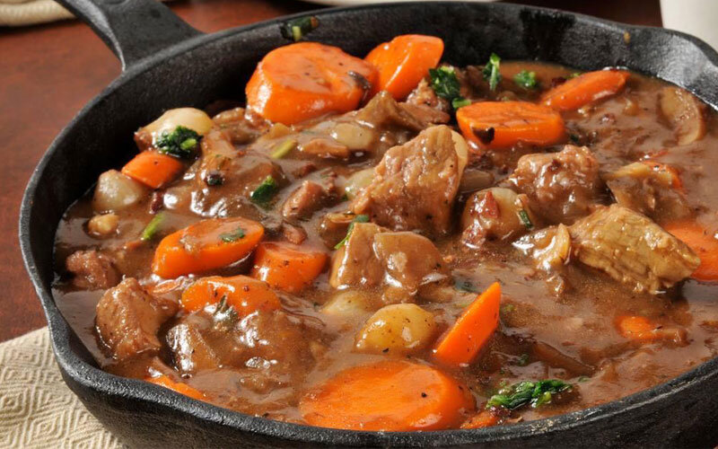 Превосходное блюдо французской кухни. Ингредиенты Рецепт приготовления 1. Говядину нарезать крупными кубиками, репчатый лук нарезать полукольцами, чеснок раздавить плоской стороной ножа. 2. Положить мясо, лук, чеснок, веточки петрушки, лавровый лист, тимьян, черный перец горошком в глубокую миску и залить красным вином. Перемешать и поставить в холодильник на сутки мариноваться. 3. Из готового маринада достать мясо, обсушить кусочки на салфетке. Бекон нарезать мелкими кубиками и обжарить в сковороде на растительном масле до золотистой корочки. 4. Извлечь бекон из сковороды и в жире и масле обжарить говядину до образования коричневой корочки. Добавить муки, перемешать и жарить еще минуту. 5. Извлечь мясо и переложить его в глубокий сотейник. Процедить через сито маринад и добавить его к мясу. Высыпать в сотейник жареный бекон и поставить мясо тушиться. 6. Через полтора часа разогреть сковородку и на смеси оливкового и сливочного масел обжарить нарезанную морковь до золотистой коро